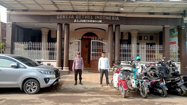 Arjawinangun, Dalam rangka mengantisipasi gangguan Kamtibmas serta tercipta situasi yang aman Anggota Polsek Arjawinangun Polresta Cirebon amankan kegiatan kebaktian umat Nasrani yang bertempat di Gereja Bethel Indonesia (GBI) – Arjawinangun yang berlokasi di Jalan Kantor Pos Desa Jungjang, Kecamatan Arjawinangun, Kabupayen Cirebon.