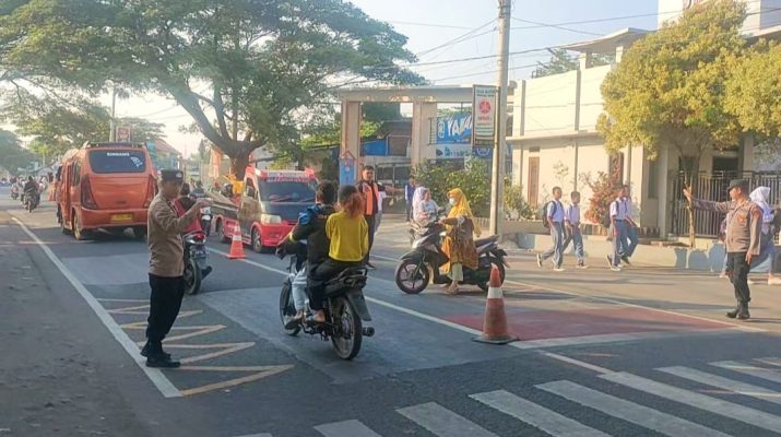 KAB. CIREBON –  Pagi hari merupakan jam sibuk lalu lintas jalan, apalagi pada saat anak-anak sekolah mulai beraktifitas menuju sekolahnya masing-masing, hal ini tentu beresiko terjadinya beberapa kerawanan seperti kemacetan, pencurian dengan kekerasan, laka lantas dan bahkan tawuran anak sekolah, untuk itu sebagai salah satu bentuk kinerja kepolisian dalam melakukan pelayanan kepada masyarakat Polsek Lemahabang Polresta Cirebon melaksanakan kegiatan pengaturan lalu lintas berbagai titik rawan salah satunya di depan SMK Muhammadiyah Lemahabang, Senin pagi (23/10/2023).