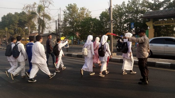 Pengaturan Lalu-lintas Polsek Plered Polresta Cirebon pagi hari memberikan pelayanan Prima kepada masyarakat dan anak sekolah