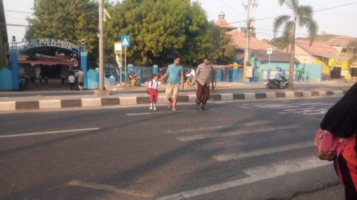 Pelayanan Lalu – lintas Polsek Plered Polresta Cirebon di pagi hari menyebrangkan anak sekolah dan masyarakat di depan SDN 3 Tegalsari