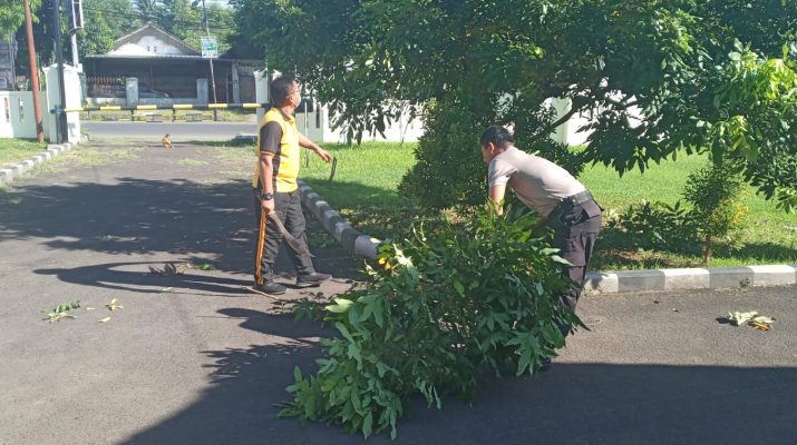 Sumber – Personil Polsek Sumber Polresta Cirebon Polda Jabar melaksanakan bersih – bersih lingkungan serta merapikan dengan memotong dahan pohon disekitar Mapolsek Sumber guna