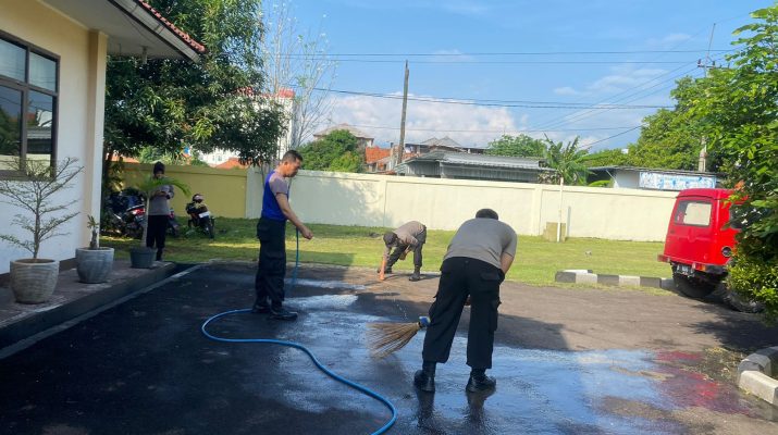 Anggota Polsek Sumber Polresta Cirebon dipimpin wakapolsek Sumber Ipda Amir.SH bersama anggota Polsek Sumber Melaksanakan Korve Bersih-Bersih Mako Polsek Sumber setelah pelaksanaan apel pagi.
