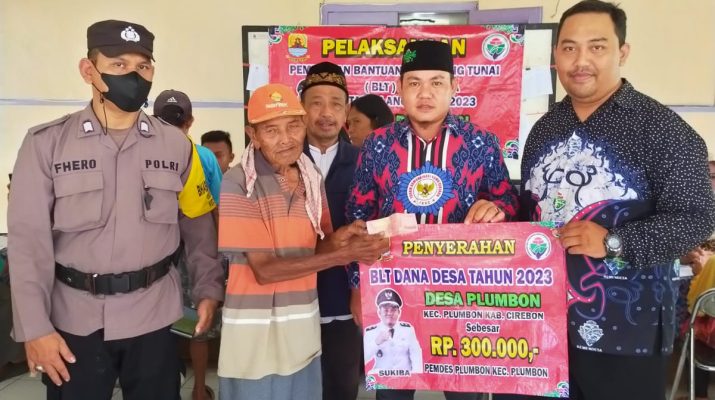 Polsek Depok Polresta Cirebon – Bhabinkamtibmas Ds. PlumbonKec. Depok Kab. Cirebon Bripka Fherorianto, SH, perangkat desa dan Pendamping Desa hadir lakukan pemantauan pembagian BLT