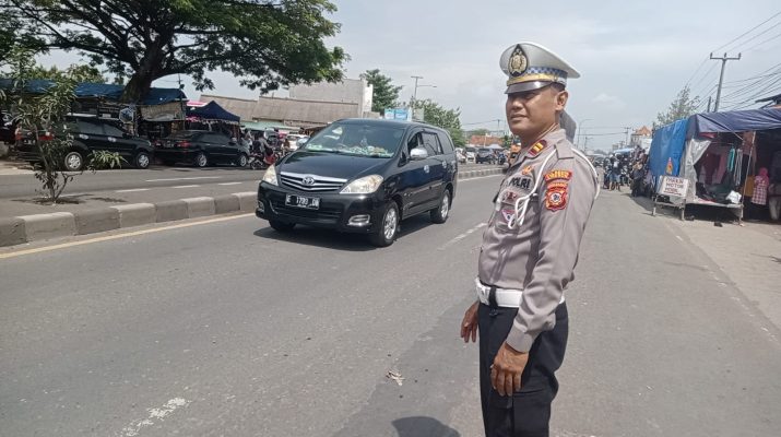 Ciptakan aman lancar Panit Lantas Polsek Arjawinangun gatur lantas di pasar sandang Tegalgubug.