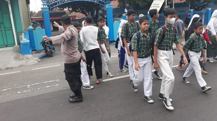 Anggota Polsek Plered melaksanakan Gatur Lalu lintas pagi di Jalan Otista di depan SDN 3 Tegalsari dan SMPN2 Plered Kec. Plered Kab. Cirebon