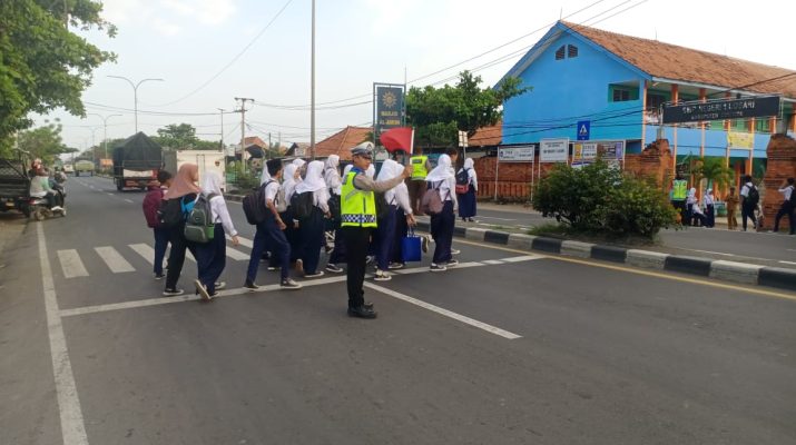 mengatur lalulintas dan menyebrangkan anak sekolah , Polsek Losari Berikan kelancaran dan kenyamanan Kepada pengendara .