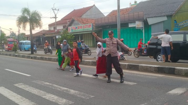 Terlihat seperti biasa dipagi hari arus lalu lintas di dominasi roda dua maupun empat cukup ramai sehingga untuk menjaga keselamatan masyarakat hendak menyeberangi jalan untuk menuju ke tempat kerja. Sekolah, kantor, pasar dan lain lain maka dengan sigap personil lantas, menghampiri masyarakat tersebut untuk membantu menyeberangi jalan.
